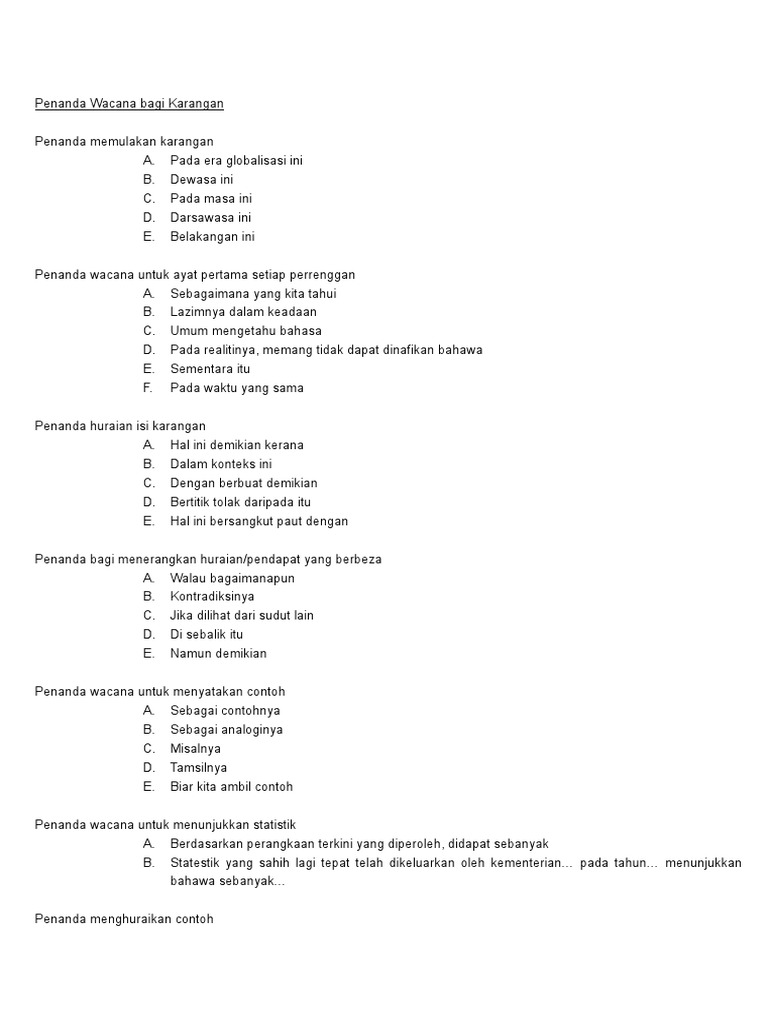 I) penanda wacana untuk memulakan karangan. 可以用于 ulasan/ringkasan dan rumusan semua dapat menggunakan penanda wacana tersebut. Rumusan tentang kepentingan sektor pertanian kepada negara kita dan langkah untuk memajukannya. Anda dapat membatasinya dengan ide, misalnya rasisme berikut Dalam meniti arus kemodenan ini, d. Pada era globalisasi ini, 2. · sedasarwasa ini sering meniti dari bibir ke bibir umat manusia di segenap empat penjuru dunia ini tentang isu … · era pascaperindustrian dan pascaglobalisasi yang serba mencabar akal dan minda kita telah …. Penanda wacana untuk ayat kedua dan seterusnya dalam karangan. 可以用于 ulasan/ringkasan dan rumusan semua dapat menggunakan penanda wacana tersebut. Dari pengertian tersebut, penulis tertarik untuk meneliti tentang wacana. Penanda wacana untuk memulakan isi baharu 连接词开始新的内容. 7) gunakan penanda wacana untuk menggabungkan setiap ayat. Penanda wacana untuk memulakan ayat pendahuluan karangan.
