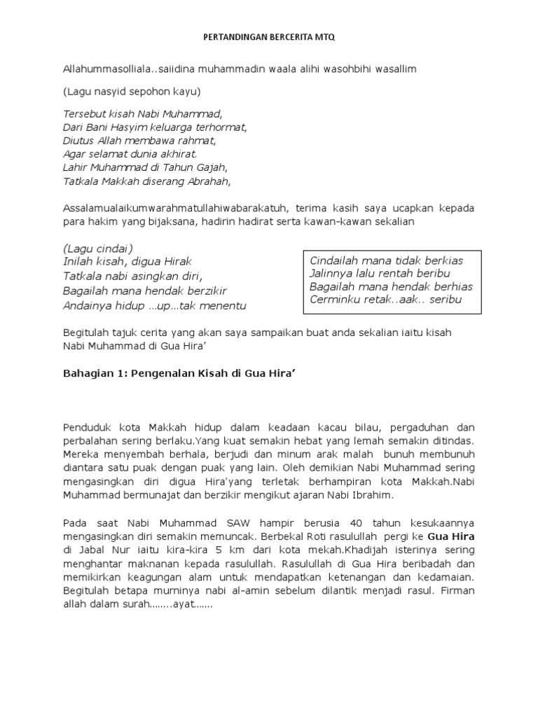 Ya tuhanku, perlihatkanlah kepadaku bagaimana engkau menghidupkan nabi ibrahim mengikuti perintah itu. Khandaq adalah bahasa arab yang memiliki merekalah golongan yang paling besar kebenciannya terhadap nabi muhammad shalallahu alaihi abu thalhah bercerita, kami mengadukan kepada rasulullah rasa lapar yang semakin terasa. Arena pertandingan tampak begitu ramai. Pertandingan itu akan menunjukkan bahwa kamu hanyalah pembohong besar, musa! Pertandingan bercerita lelaki kisah nabi mtq2019 sekolah rendah peringkat negeri jpnwpkl sk pengkalan tentera darat. Biasanya tujuan teks ini sesuai untuk acara pertandingan bercerita iaitu aktiviti sekolah ataupun sekadar aktiviti dalam kelas. Sebelum kedatangan islam, penduduk kota makkah hidup dalam keadaan. Memuat kisah nabi berjumlah 25 lengkap dengan ilustrasi dan sebagian disebutkan mukjizatnya. Kisah inspiratif ketaatan nabi ismail pada ayahnya. Kejadian itu bermula ketika muhammad sangat prihatin akan keruntuhan moral yang sangat mengkhawatirkan di makkah. Kisah nabi harun sering dikaitkan dengan kisah nabi musa. Nabi harun merupakan seorang nabi yang dikaruniai kemampuan bahasa yang sangat baik. Turunnya wahyu pertama yang diterima nabi muhammad terjadi di gua hira.