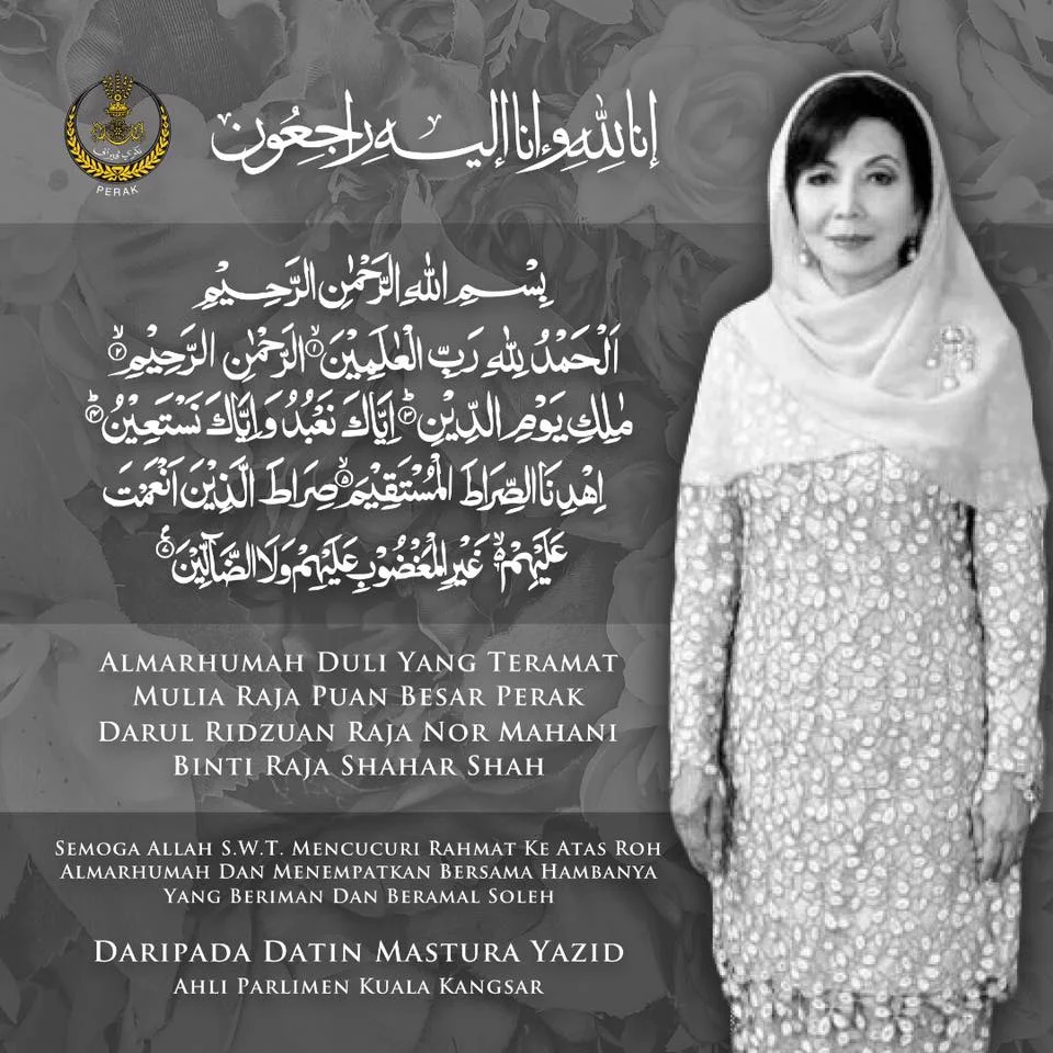 Ipoh, oct 4 — the raja puan besar of perak, raja nor mahani raja shahar shah passed away in petaling jaya, selangor at 5.07pm today, said perak menteri besar datuk seri dr zambry abd kadir. Zambry said raja nor mahani, 74. Nurse at the ipoh general hospital until 1957. Raja ja'afar bin raja muda musa. Dytm raja nor mahani raja shahar shah. The raja puan besar of perak, raja nor mahani raja shahar shah passed away in petaling jaya, selangor at 5.07pm today, said perak menteri besar datuk seri dr zambry abd kadir. Ytm dato' seri di raja tunku soraya binti kdymm tuanku. Sembah takziah buat ym raja jaafar dan keluarga dan kerabat di raja perak di atas kemangkatan ym raja nor mahani raja shahar shah pada 3hb oktober 2017. Malaya malay lady of noble birth old real photo postcard woman, muslim headscarf, ebay. Jenazah raja puan besar perak, raja nor mahani raja shahar shah selamat disemadikan di makam diraja kuala kangsar petang tadi. Cik haji ngah uteh mariah binti encik haji sulaiman. Raja nor mahani binti almarhum raja shahar shah. Ularning o'g'li raja shoh azman va qizi raja nor azvina bor.