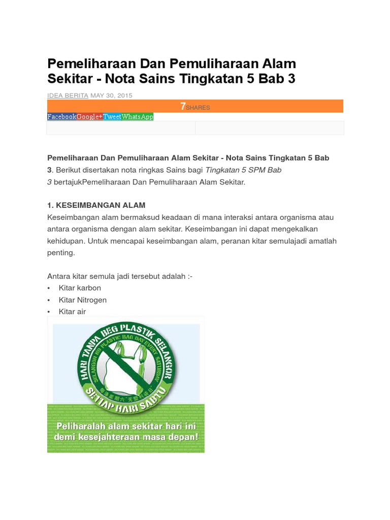 Nota Padat Sains Tingkatan 5 E Perkhidmatan from e-perkhidmatan.com S h a y l e n m u r a l i 2. Video ini menerangkan dengan terperinci tentang punca, kesan dan langkah pengawalan pencemaran alam sekitar dalam bentuk yang mudah, ringkas dan senang difah. Maksud pemeliharaan dan pemuliharaan •pemeliharaan : Interested in flipbooks about nota bab 3 ting 5 pemeliharaan dan pemuliharaan alam sekitar? Pemeliharaan bermaksud perbuatan memelihara, pembelaan, , perawatan, manakala pemuliharaan adalah perihal. Chong kum ying, thong kum soon, dan nor mazliana abdul hashim, (2012), sains tingkatan 5. Feb 02, 2021 · kuiz sains tingkatan 5 bab 3. Sains tingkatan 5| kssm | bab 3 | 3.3 pemeliharaan dan pemuliharaan alam sekitar |#sainstingkatan5